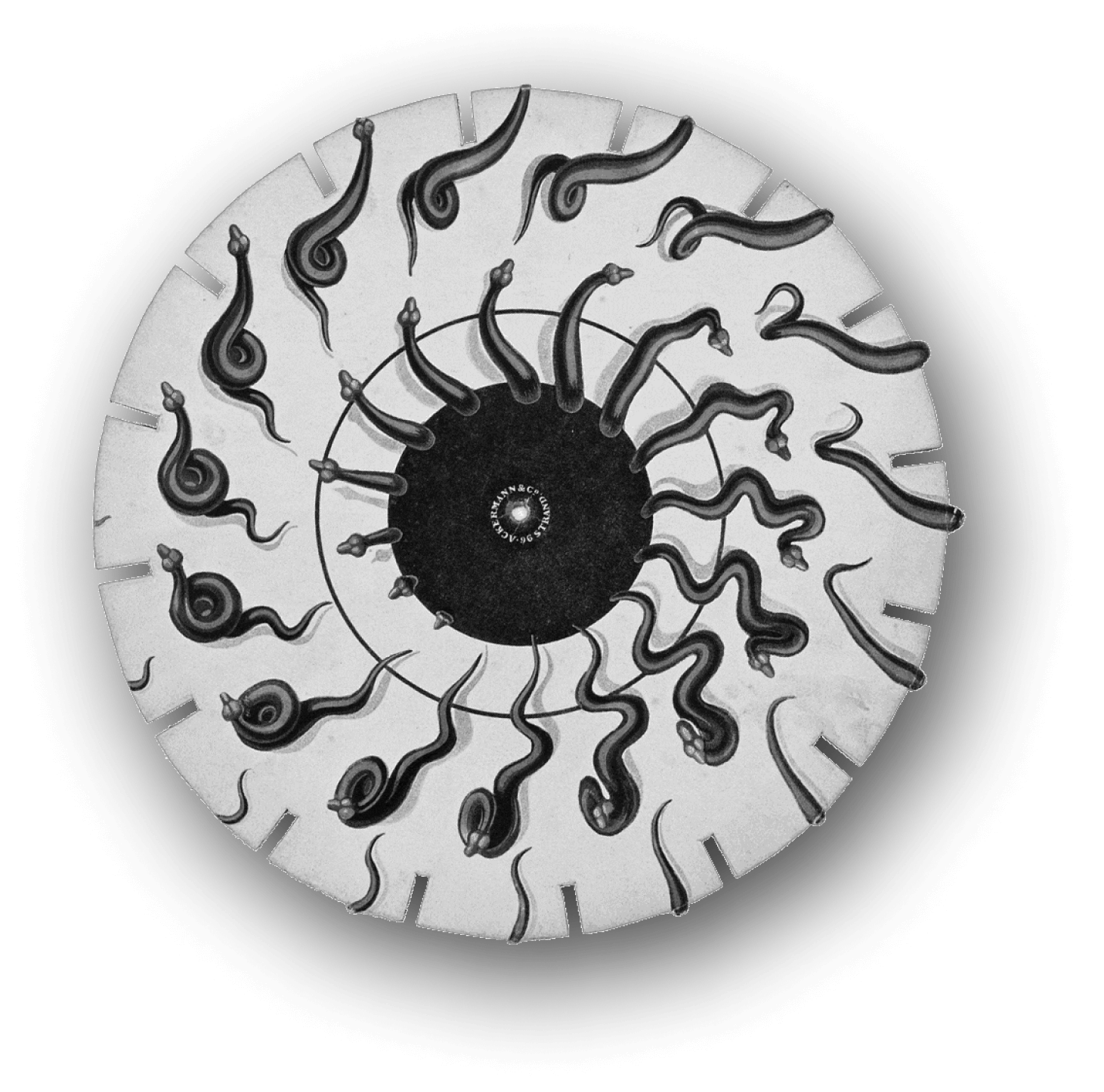 Фенакистископ представляет собой диск с отверстиями по периметру и набором изображений, которые при вращении создают иллюзию движения. устройство позволяет увидеть моментальную смену картин, образуя четкие и непрерывные анимационные эффекты.